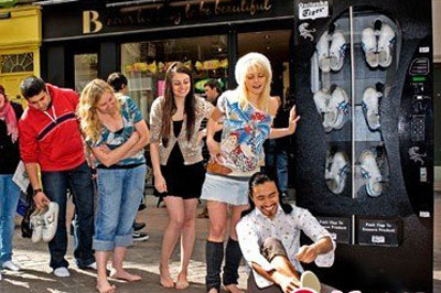 女孩子們穿著高跟鞋跳舞、逛街很長一段時間后,你的腳也許已經(jīng)不能再忍受勞累和疼痛,這是你也許最想的是能換穿一雙休閑的平底運動鞋,那該多舒服啊,但你要的鞋子不會從天上掉下來,鞋店也并不是那么容易馬上可以找到。近日,日本一著名運動品牌在倫敦推出了一種新穎的自動售鞋機,讓你馬上擁有運動鞋的夢變?yōu)榱爽F(xiàn)實。每臺自動售鞋機里可以放24雙6種尺碼的運動鞋,售價在60-80美元,操作和你在自動售貨機買飲料基本相同,只是售鞋機吐出的是鞋子罷了。