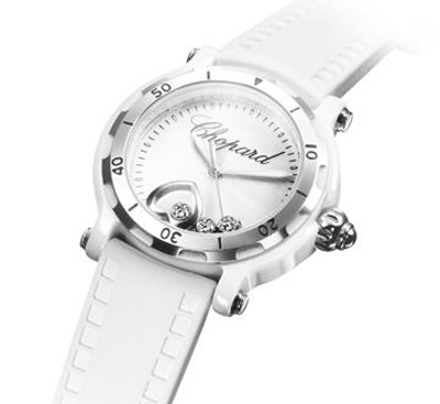 版本的快樂心腕表。白色橡膠表帶飾有象征愛情的符號,三顆鉆石在表盤上不停轉(zhuǎn)動,其中一顆更被溫柔地抱緊于白金心形的懷抱當(dāng)中。以一種浪漫而微妙的方式展示著愛與被愛。