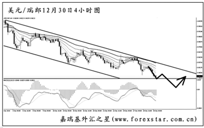 ▲美元兌瑞郎跌破日線圖旗形下沿之后,沿通道一路走弱,目前匯價正在挑戰(zhàn)10月中旬的低點0.9460支撐,跌破后下方空間將無比廣闊。最近瑞郎的走勢分化,且是歐系貨幣中最強勁的。目前對美元兌瑞郎絕對不能抱以抓底的思路,應等待調整節(jié)奏出現(xiàn)后繼續(xù)做空。