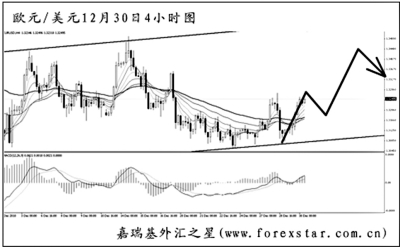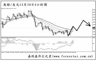 ▲英鎊兌美元短線下跌的動能有所減緩,圖中MACD的底背離發(fā)揮了一定的效果,匯價已經(jīng)將均線系統(tǒng)升破,客觀趨勢進入到轉換市。圖中道氏理論顯著高點阻力1.5510已被突破,后市英鎊將上行挑戰(zhàn)1.5650一線?紤]到英鎊的弱勢,匯價直接大幅沖高的希望不大。