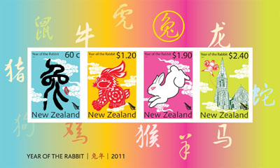 為慶祝辛卯兔年,新西蘭郵政局將于2011年1月12日正式發(fā)行兔年紀念郵票。這套兔年郵票包括一套4張面值為60分、1.2新西蘭元、1.9新元、2.4新元郵票以及小型張,首日封,郵戳和集郵套裝。兔年郵票由新西蘭華裔設計師李勃以及他的團隊“勃亞傳播”設計。圖為將由新西蘭郵政局發(fā)行的兔年紀念郵票小型張。