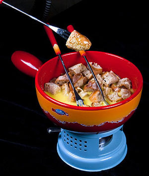 2.法棍面包塊串上竹簽,蘸上奶酪火鍋醬食用;奶酪火鍋醬也可以和蔬菜搭配,如西蘭花、蘑菇等,但食用前需開水燙熟。