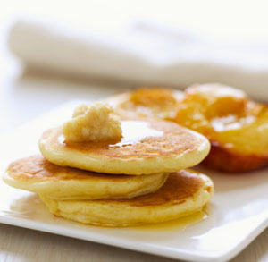 2.把不粘鍋用慢火加熱,一小勺黃油在鍋上融化攤勻,將拌好的面糊放一勺在鍋上,攤成荷包蛋大小,煎1分半鐘,將美國切達(dá)奶酪切絲放在面餅上,再加少許面糊,翻個面再煎1分半鐘,食用時拌糖粉少許即可。