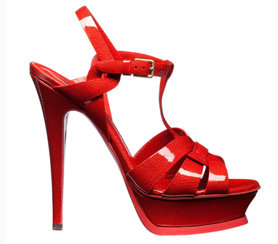YSL的Tribute系列有多種款式,包括船鞋、T帶涼鞋和slingback涼鞋等,其中標識度最高的當屬T帶涼鞋,每季款式不變,色彩和材質隨潮流而變。Tribute系列的典型標志是層次鮮明的水臺底,鞋尖部分削掉一塊,不顯厚重。2011早春系列的Tribute