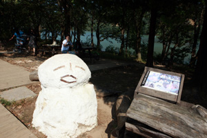 從音樂(lè)博物館后門(mén)出來(lái),一大片碧綠的青草地就在眼前。綠草茵茵,樹(shù)木環(huán)繞,分外怡情。而穿過(guò)大草坪,就看到湖邊立著個(gè)可愛(ài)的大雪人,還有一條長(zhǎng)凳。這就是《冬季戀歌》中主人公留下初吻回憶的地方,可愛(ài)的雪人正是他們的杰作,旁邊還擺放著兩位主角的照片。坐在長(zhǎng)凳上,看著他們含情脈脈的笑容,撫摸著潔白的雪人,重溫“戀歌”場(chǎng)景,再次感受到了純真初戀的美好。