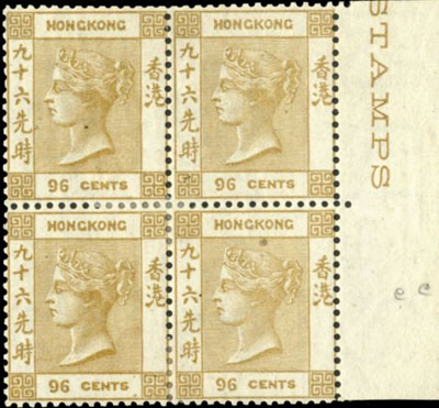 由于存世新票為數(shù)極少,香港維多利亞女皇像96先時橄欖棕色四方連郵票不時與中國大陸“改值小字”郵票相提并論,兩者同樣珍稀及深受藏家追捧。96先時橄欖棕色四方連票作為香港集郵界中的頂級瑰寶,可謂當之無愧!