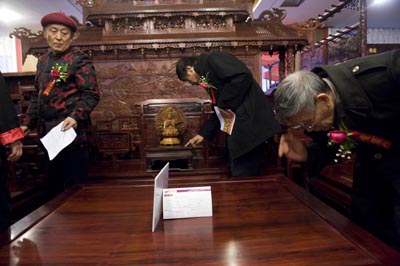 古典紅木家具專家王秀林(左)、胡德生(中)、楊家駒在北京一處家具商城查看紅木家具的品質(zhì)。 記者