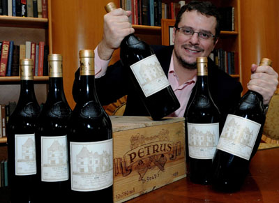 1月19日,媒體預展上工作人員正展示估價12萬至16萬港元的6瓶1.5公升裝1989年奧比昂佳釀和一箱估價28萬至40萬港元的12瓶裝1989年柏翠寶佳釀(中)! 1月21日至22日,Acker Merrall&Condit名酒拍賣行將在香港港島香格里拉大酒店及香港君悅酒店舉行2011年首場名酒拍賣會,將呈獻共1200批來自顯赫窖藏之頂級名釀,總估值高達七千萬港元。