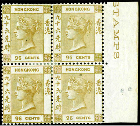 圖為以640萬(wàn)港元成交的錯(cuò)色印刷香港維多利亞女皇像96先時(shí)橄欖棕色四方連帶原膠郵票。