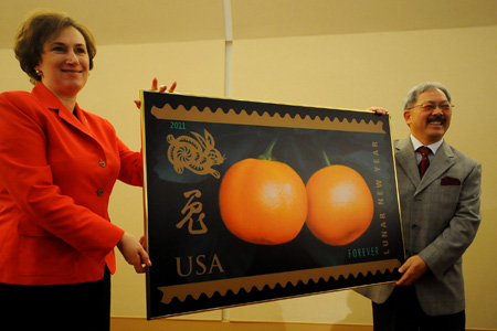 美國郵政局1月22日開始發(fā)行農(nóng)歷兔年生肖郵票,舊金山各界當天為此舉行慶祝儀式。