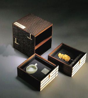 古時(shí)文人的文玩盒,原先是用來放置筆、墨、紙、硯等文房用品的。但是隨著文玩種類的逐漸增多,其中也開始收納例如鎮(zhèn)紙、印章等,由于數(shù)量越來越多,且其中物品的實(shí)用性逐漸減弱,而觀賞性逐漸增強(qiáng),因此其也被稱為是文人的“玩具箱”。在2009年北京保利的秋拍中,一套書卷式百寶盒及文房珍玩(十六件)以17.92萬元成交。