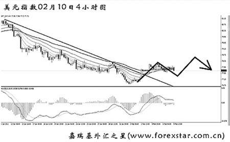 從圖上看,美元指數(shù)未能挑戰(zhàn)前方低點(diǎn)75.60一線的支撐,自低位強(qiáng)力反彈,將圖中的下降趨勢線升破,此前持續(xù)的MACD底背離信號(hào)發(fā)揮了一定的效果。4小時(shí)圖上美元指數(shù)下跌的道氏理論最后一個(gè)顯著高點(diǎn)在78.30,在有效突破此位置之前,美元指數(shù)很難展開持續(xù)的上漲,預(yù)計(jì)未來一周美元指數(shù)仍會(huì)對(duì)此阻力發(fā)起有力的沖擊。