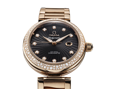 歐米茄Ladymatic18K紅金女表采用紅金表鏈,搶眼的黑色表盤上,小時刻度鑲嵌有11顆晶瑩美鉆,另有日期視窗。表圈以“雪花鑲嵌”的手法鋪就大量鉆石,盡呈華貴典雅之美。該表款可謂內(nèi)外兼修,采用歐米茄獨有的8521同軸機芯,搭配“Si14”硅游絲擺輪。售后服務(wù)保證長達4年。