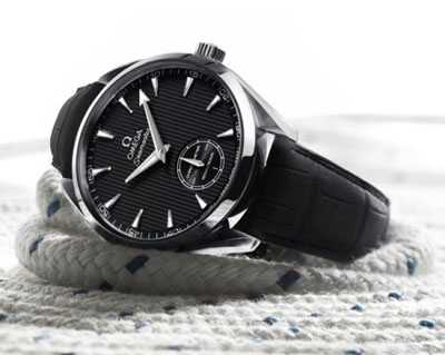 小秒針小表盤位于6時位置。兩個表款均搭配有黑色鱷魚皮表帶,表帶內(nèi)側(cè)車以紅線。為歐米茄海馬Aqua