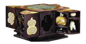 多寶格的設(shè)計,琳瑯多樣,精巧無比,不論盒、匣、箱、柜,皆是一種妥善利用空間的工藝作品、以最有限的空間,存放最多的物品,在造型上,力求美觀精巧,所以往往一件多寶格,箱蓋中有盒、盒中有套匣、套匣中又有屜、隱隱約約、輾轉(zhuǎn)曲折,有時一個轉(zhuǎn)紐,便見門,門之后,另有一番天地。故多寶格體積雖小僅及尺許,而其所藏珍玩,每每多達(dá)數(shù)十,乃至百件,因此觀賞時常有尋尋覓覓、撲朔迷離的趣味。
