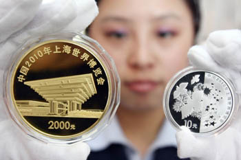 上海世博會第二組彩色金銀紀念幣。新華社發(fā)(陳代述/攝) |
