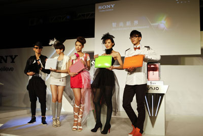 在上海舉行的以“智尚新界”為主題的索尼VAIO春季個人電腦新品發(fā)布會上,索尼集中發(fā)布了今年春季面向中國市場推出的5大系列多款VAIO筆記本電腦新品,其中包括其首款3D筆記本電腦。圖為模特在展示C系列新品筆記本電腦。