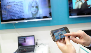 在第十九屆中國國際廣播電視信息網(wǎng)絡展覽會上,一家公司的工作人員在展示電腦、電視、手機三屏互動系統(tǒng)。新華社記者金良快攝 |