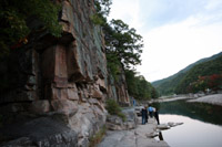 從最著名的章回碼頭上船,沿江而下,美麗的丹陽(yáng)八景就徐徐展現(xiàn)眼前。八景中最著名的,要屬“島潭三峰”,即聳立在呈“S”形彎曲的南漢江中心部位的三塊巖石。河流中心,三塊巖石按序排列,這一景致實(shí)屬罕見。有趣的是,這三塊巖石還各有名字,也有個(gè)故事呢。相傳,過去有對(duì)恩愛夫婦膝下無子,為了繁衍后代,丈夫娶了妾,但這個(gè)小妾一懷上孩子就虐待正室,弄得家里雞犬不寧。上天為了懲罰他們,就將三人都變成了石頭。因此,三峰中,以雄偉之姿立于中心的那塊高達(dá)6米的大巖石就是夫峰(又稱將軍峰),以優(yōu)雅模樣各據(jù)一邊的是妻峰(又稱兒峰)與妾峰(又稱女兒峰)。也有傳說三峰原屬于江原道正善郡,有一次發(fā)大水,三峰山隨著水流流到南韓江,成為現(xiàn)今的島潭三峰。