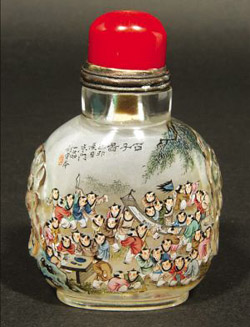 1949年新中國成立,為恢復(fù)傳統(tǒng)的藝術(shù)文化,1953年國家為葉曉峰、葉奉祺于北京成立一車間,開班授徒,四名學(xué)徒為王習(xí)三(現(xiàn)為中國工藝美術(shù)大師)、劉守本(現(xiàn)為中國工藝美術(shù)大師)、葉樹英、丁桂玲。當(dāng)今京派掌門人劉守本大師繼承傳統(tǒng)京派風(fēng)格,他全面繼承了葉家內(nèi)畫傳統(tǒng)技藝,并從傳統(tǒng)中總結(jié)經(jīng)驗(yàn),創(chuàng)立了更完善的技法,形成自己獨(dú)特的技術(shù)風(fēng)格,在京城文化的吸引和熏陶之下,劉守本大師的內(nèi)畫鼻煙壺也呈現(xiàn)出濃郁的京味。北京瀚海2009春季拍賣會(huì)上,劉守本大師的《百子圖》以12萬元成交。