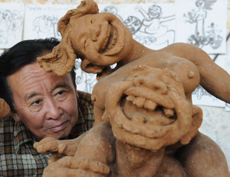 圖為在天津薊縣泥塑創(chuàng)作室,農(nóng)民雕塑家于慶成創(chuàng)作農(nóng)村題材新作品。