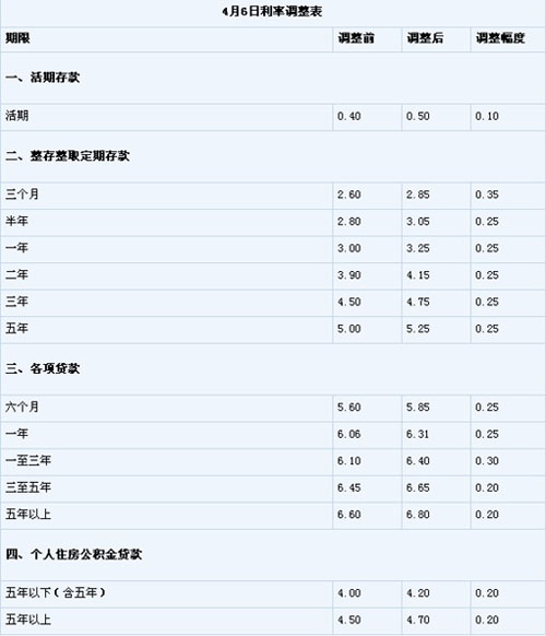 中國人民銀行決定,自2011年4月6日起上調(diào)金融機(jī)構(gòu)人民幣存貸款基準(zhǔn)利率。金融機(jī)構(gòu)一年期存貸款基準(zhǔn)利率分別上調(diào)0.25個(gè)百分點(diǎn),其他各檔次存貸款基準(zhǔn)利率及個(gè)人住房公積金貸款利率相應(yīng)調(diào)整(見附表)。