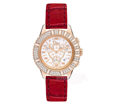 迪奧晶鉆系列玫瑰金計時表直徑38毫米,搭載ETA石英計時表機芯,玫瑰金表殼鑲嵌鉆石與白色藍寶石水晶,黃金收邊的白色烤漆表盤,紅色鱷魚皮表帶搭配玫瑰金折疊表扣。售價:152000元