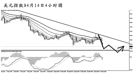 美元指數(shù)沿圖中的下降趨勢線步步走低,在跌破75.60的支撐之后,下方將考驗2009年11月的低點74.15。短線空頭動能有所減弱,但目前還沒有任何跡象表明美元指數(shù)即將見底。4小時圖道氏理論最后兩個顯著高點阻力在75.05和75.15,只有將這一帶阻力有效升破,后市才可期待較為明顯的反彈走勢發(fā)生。目前應繼續(xù)對美元抱以看空的思路。