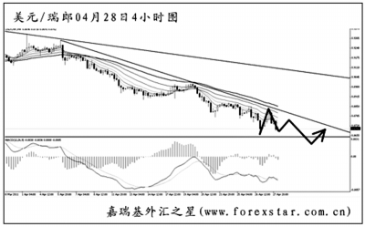 ▲美元兌瑞郎在跌破0.9635的支撐之后,下方已無任何可以阻擋住匯價下跌的點位。周線圖K線4連陰,下跌勢頭無比強勁。最近美元兌瑞郎的下降趨勢線不斷下調(diào),斜率逐次加大,雖然日線圖和4小時圖都發(fā)生了角度明顯的MACD底背離信號,但在有效突破壓力線和均線系統(tǒng)之前,仍需繼續(xù)看空。