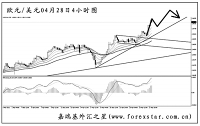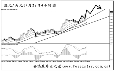 ▲澳元兌美元近來的強勢可謂令人咋舌,匯價不斷刷新高點,似乎有一飛沖天的架勢。日線圖上看,始于去年5月的上升趨勢線不斷調(diào)整,但澳元始終沒有筑頂成功。短線匯價的上漲力度強勁,4小時圖中的趨勢線角度有所加大,目前澳元面臨一波下行回落,但跌破趨勢線的概率不大,后市有望再度創(chuàng)出新高。