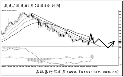 ▲美元兌日元在圖中下降趨勢線的壓制下一路走低,在經(jīng)歷了下跌動能逐漸減弱的過程之后,匯價終于上破壓力線,同時將道氏理論最后一個顯著高點82.40突破。由于目前匯價繼續(xù)探向前方低點,所以尚不能認為此波下跌趨勢結束。預計后市匯價有望再創(chuàng)新低,此后緩步反彈上行。