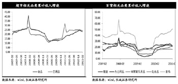 通脹對商業(yè)的利好逐步顯現(xiàn)。實證分析表明,通脹在3%至5%對行業(yè)同店銷售增速和毛利率提升最為顯著,通縮以及8%以上的惡性通脹對行業(yè)影響負(fù)面,3%以下對毛利率提升不是非常顯著。第一季度,各業(yè)態(tài)客單價均有明顯提升,客流量保持穩(wěn)定,預(yù)期超市企業(yè)的同店銷售增速在10%至20%左右,百貨公司同店銷售增速在15%至25%左右,通脹對行業(yè)的正面效應(yīng)明顯。