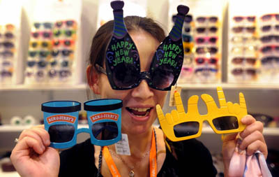 由4000多家參展商參加的全球最大禮品展——第26屆香港禮品及贈(zèng)品展日前在香港會(huì)展中心舉行。本屆展會(huì)展示了各類環(huán)保禮品,以及高品質(zhì)的品牌設(shè)計(jì)理念。圖為一名參展商在展示藝術(shù)造型眼鏡。