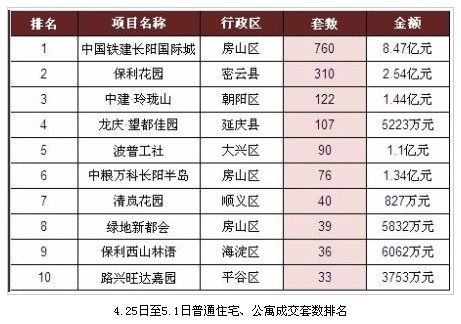 根據(jù)偉業(yè)我愛我家市研院整理的《4.25日至5.1日普通住宅、公寓成交套數(shù)排名》中可以看出,4月最后一周一手房銷售最旺盛的10家項目全部位于五環(huán)路外。