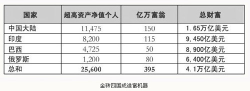 但全球范圍內(nèi)億萬(wàn)富翁和有心成為億萬(wàn)富翁的超富人口數(shù)量增長(zhǎng)最快的,卻有可能是金磚四國(guó),而不是美國(guó)或歐洲。