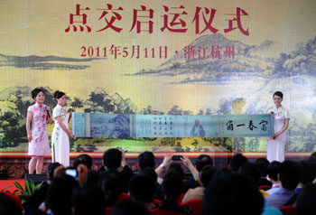 點(diǎn)交儀式前浙江博物館工作人員根據(jù)一幅《富春山居圖“剩山圖”的復(fù)制品進(jìn)行講解。記者 韓傳號(hào)/攝 |