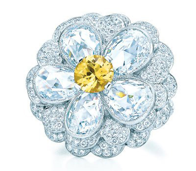 仲夏即至,花開絢爛,迷醉芳心;ǘ涞幕ò陮盈B舒展,其盛放的美態(tài)一直是蒂芙尼最為非凡的藝術(shù)創(chuàng)作題材之一。華美鉆石采用傳統(tǒng)的玫瑰式切割技法,這一早期誕生的切割風(fēng)格完美詮釋出玫瑰花嬌艷欲滴的花瓣形態(tài)。四周層疊鋪嵌的鉆石閃耀極致光芒,只為凸顯花蕊處無限璀璨的枕形黃色藍(lán)寶石。戒圈采用鉑金材質(zhì)。蒂芙尼鉆石之花,深邃光芒,綻放指間。