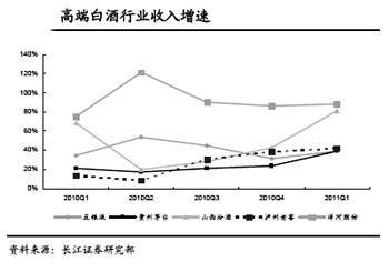 白酒行業(yè)、啤酒行業(yè)、葡萄酒行業(yè)、乳制品行業(yè)和其他食品飲料公司在2011年一季度保持了20%以上的收入增長(zhǎng),其中白酒行業(yè)收入增速提升至49%。食品飲料行業(yè)總體在2010年和2011年一季度收入高速增長(zhǎng),白酒行業(yè)在食品飲料細(xì)分行業(yè)中表現(xiàn)出了收入強(qiáng)勁增長(zhǎng)的趨勢(shì)。從2011年一季報(bào)收入、成本、費(fèi)用變化趨勢(shì)看,我們認(rèn)為白酒行業(yè)仍然是2011年業(yè)績(jī)高增長(zhǎng)的行業(yè)。