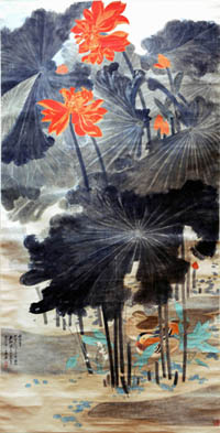 作于1947年的設(shè)色紙本立軸《嘉耦圖》長(zhǎng)約1.84米、寬約0.9米,以荷花入畫,寓意佳偶天成。畫中精工細(xì)致的描金朱荷,在墨綠漬染的田田茂葉的襯托下,富麗堂皇而不沾匠俗之氣,濃蔭中的雙棲鴛鴦色彩斑斕、悠然自得。全畫氣度宏大、層次井然,是張大千潑彩潑墨畫法的代表作。