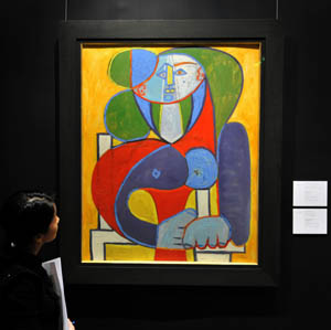 5月27日,一名參觀者在觀看畢加索的油畫作品《法蘭斯雅絲半身像》(估價700萬-1000萬英鎊)。當(dāng)日,倫敦佳士得拍賣會會前“世界繪畫藝術(shù)精品拍賣預(yù)展”在香港會展中心開幕。