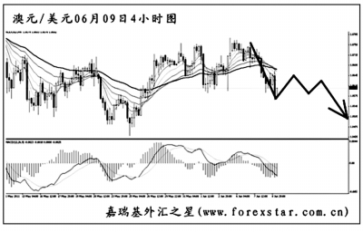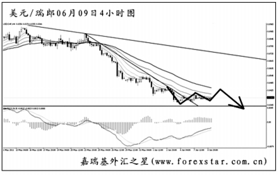 ▲美元兌瑞郎強(qiáng)力探底之后放慢了下跌的腳步,圖中下降趨勢線已被升破,目前匯價(jià)在進(jìn)行修正調(diào)整。由于均線系統(tǒng)和道氏高點(diǎn)的阻力0.8450一線未被升破,后市仍有望再度創(chuàng)出新低。日線圖上看,匯價(jià)的下行斜率實(shí)在過大,所以美元兌瑞郎發(fā)起一輪上調(diào)的可能性不低,但操作上仍以謹(jǐn)慎看空為主,嚴(yán)格放置止損位。