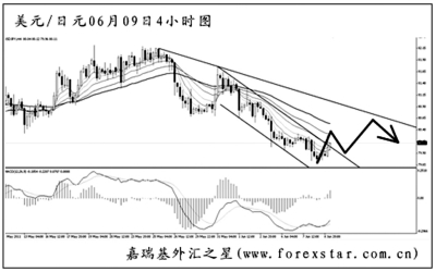ACD底背離信號,預(yù)計(jì)匯價(jià)回抽通道上沿之后將發(fā)起一輪上攻。上攻的目標(biāo)有望指向圖中上方的下降壓力線,初步阻力在80.90一線。最近美元兌日元的走勢較為凌亂,交易上需謹(jǐn)慎小心。