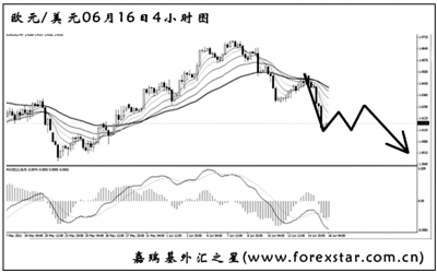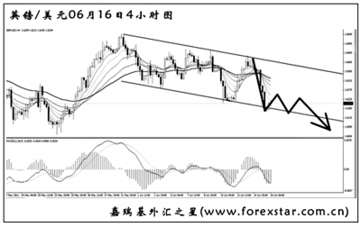 歐元兌美元上漲到1.4940高點(diǎn)后的下跌回落十分強(qiáng)勁,并且跌破了日線圖道氏低點(diǎn)的支撐1.4155,隨后匯價(jià)發(fā)生反彈,但反彈點(diǎn)位剛好到達(dá)黃金分割76.4%的回調(diào)位,歐元目前繼續(xù)展開下跌趨勢(shì)。后市歐元非常有可能再次挑戰(zhàn)1.4000下方的5月下旬支撐,短線下跌力度強(qiáng)勁,目前應(yīng)以做空歐元為主。