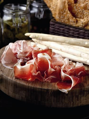 在Parma地區(qū),每年除了出產(chǎn)火腿,在春季,蘆筍成熟之后,自然成為了火腿最完美的搭檔。到了夏天,意大利人還喜歡用火腿來(lái)搭配當(dāng)?shù)氐奶鸸,美美地品嘗一番;鹜鹊南条r與甜瓜的多汁香甜也許可稱(chēng)得上是這個(gè)世界上絕佳搭配之一了。一個(gè)是自然賦予我們的最新鮮的珍饈,一個(gè)是依靠人類(lèi)智慧的傳承而創(chuàng)造的美饌。如此美味怎能不調(diào)和點(diǎn)美酒加以寥寂呢?對(duì)于火腿鮮中帶咸的口感,最完美的搭配要數(shù)具有果味的紅葡萄酒,如merlot,酒中濃郁的果香和酸味可以完美地烘托出火腿咸中帶鮮的味道,并把其鮮味最大程度地釋放在舌尖。