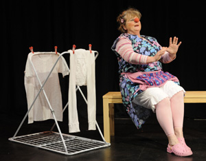 她臉上化著淡妝,身穿一條普通裙子,外罩一條圍裙,表演內(nèi)容包括與一匹布馬爭斗,隨后一邊等待衣物變干,一邊聽收音機,跟隨音樂打拍子,左搖右晃,最后跳起舞來。
