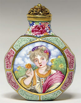高價(jià)成交的銅胎畫琺瑯鼻煙壺壺體通常為扁圓的基本造型,偶有六方、圓形以及特異形,主題紋飾常見人物、花卉、瓜果、動(dòng)物、山水等紋飾,如開光內(nèi)繪西洋人物、仕女圖、五福人物、山水人物圖,樹木花卉、百花、蓮池、喜報(bào)春先圖以及錦雞玉堂富貴、鵪鶉詩(shī)文、花鳥、西洋鐘表圖等等,像2007年香港佳士得以360.75萬港幣拍出的清代西洋表銅胎畫琺瑯嵌珍珠葡萄鼻煙壺那樣的奇異造型者,極為少見,僅發(fā)現(xiàn)臺(tái)北故宮博物院收藏有2件類似品。