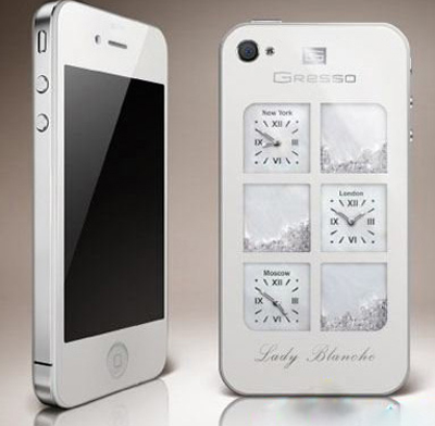Blanche的iPhone外殼,售價3萬美元。此款外殼背部有三個時鐘,以及三個里面裝了鉆石的小盒子。整個外套背面由金剛石涂層的礦物玻璃制成。