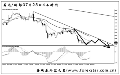 美元兌瑞郎在經過一段震蕩走勢之后繼續(xù)創(chuàng)新低,瑞郎的漲勢無法阻擋。由于瑞郎最近持續(xù)處于極端強勢的走勢中,且下方沒有任何有效支撐,短線匯價即使展開一小波調整,但升破圖中下降趨勢線及均線系統的希望也不大,后市美元兌瑞郎將以沖高后繼續(xù)走低的趨勢為主。