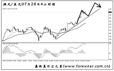 澳元兌美元經過了2個半月的調整,終于再度上沖創(chuàng)出新高,日線圖的次要節(jié)奏調整宣告成立。由于澳元上方也沒有任何有效的阻力,現在的操作思路以做多為主。圖中的上升趨勢線為最近的支撐,警惕匯價向此趨勢線調整,但直接跌破的希望不大。
