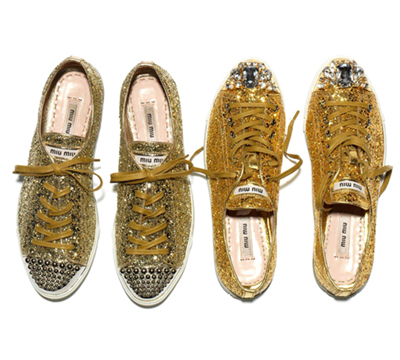 Miu Miu(繆繆)這雙鞋子有木有閃到你!運(yùn)動(dòng)休閑范兒,也可以這么華麗。層層金色,閃閃發(fā)光,簡(jiǎn)直太配金秋季節(jié)了。 橡膠的鞋底,鞋上還配有金屬鉚釘和鉆石,加上金色的涂層,金色的鞋帶,張揚(yáng)的個(gè)性與時(shí)尚氣息并存。不做淑女,不走婀娜的步伐,要的就是大氣和率性。 在Miu Miu 秋季秀場(chǎng)上,如果說(shuō)T臺(tái)是一條悠長(zhǎng)的銀河,那么這雙鞋便是銀河里最最耀眼的星!